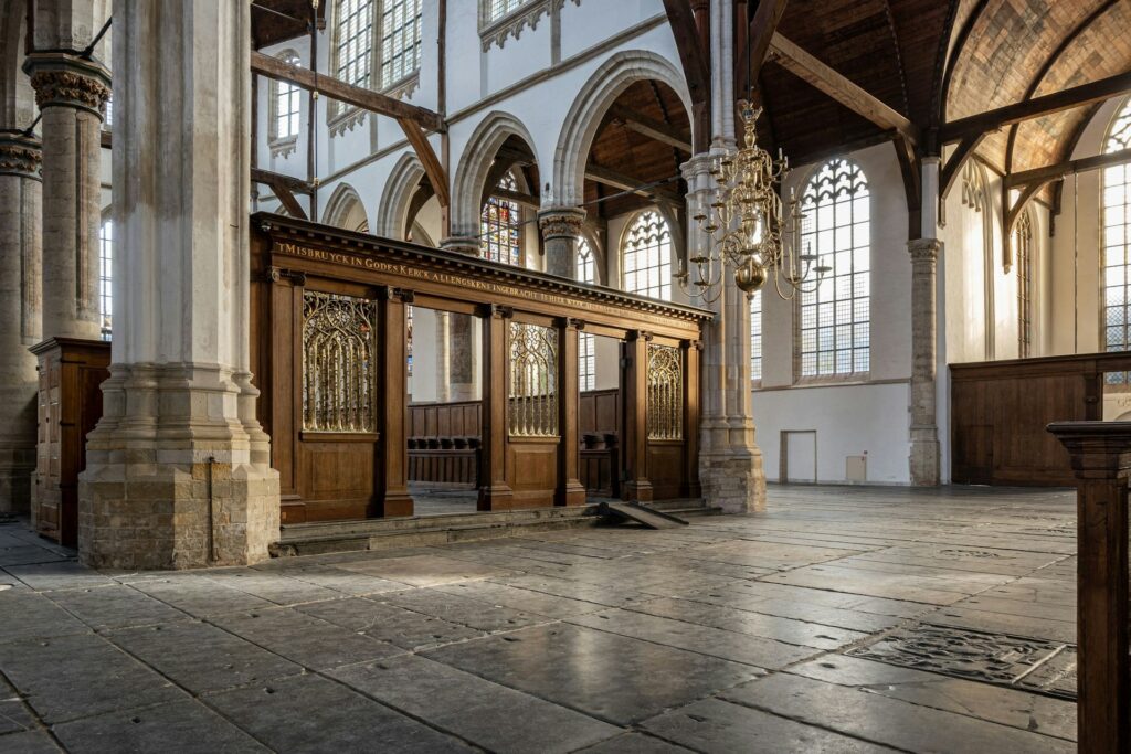 This photo library displays the magnificent Gothic architecture of Amsterdam’s oldest building. You can view the soaring wooden barrel vault, the largest in Europe, and the worn texture of the gravestone floor. Use these pictures to scout the best angles for architectural photography or to visualize the vast open space of the nave.